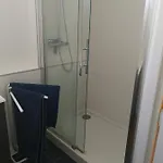 The bathroom features a separate toilet and a shower, along with hairdryers and towels.